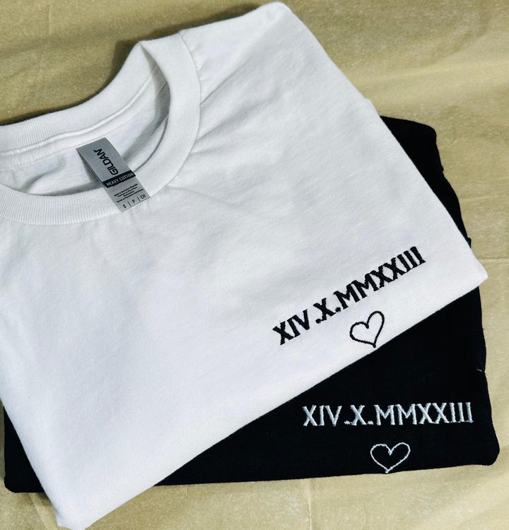 🎨 Personnalisation Romantique : Offrez ou portez un t-shirt brodé unique avec une date spéciale inscrite en chiffre romain, que ce soit la date de votre rencontre, de mariage, ou tout autre moment significatif. Ajoutez-y une touche de douceur en choisissant parmi 6 différents cœurs brodés (disponibles dans les photos du produit).